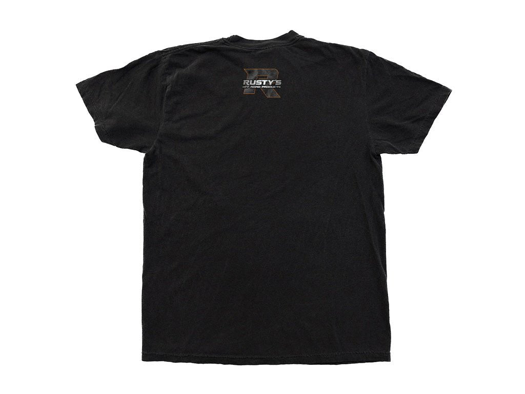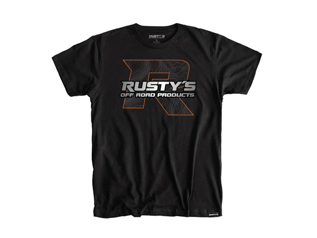 Introducing our stylish and comfortable black short sleeve t-shirt featuring the iconic Rusty's Offroad Products logo with a topographic map infilled R. Crafted from high-quality materials, this t-shirt is perfect for any casual occasion, whether you're hitting the trails or simply running errands around town. The sleek black color complements any outfit, while the topographic map-infused R adds a unique and eye-catching touch.