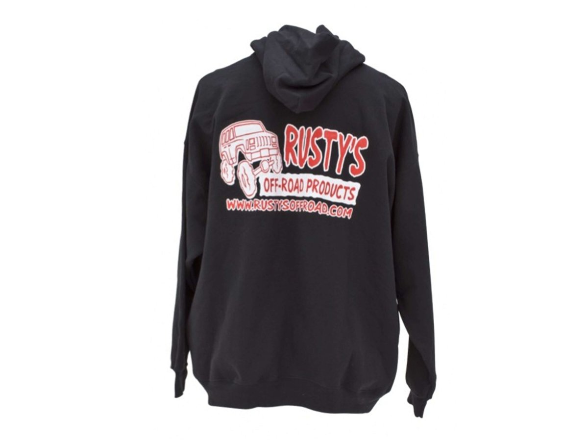 These black hooded sweatshirts have Rusty's logo screen printed on the left chest and full back and have a nice, thick lining. Sizes run a little small so if in doubt, order size larger.
