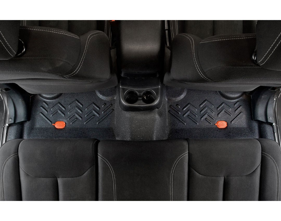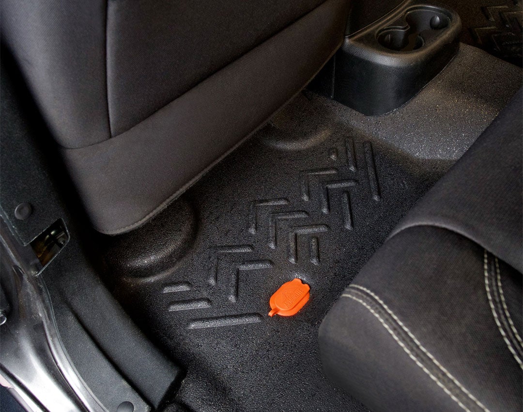 Includes front and rear flooring (driver’s side front, passenger side front and rear seat) for Jeep® Wrangler JK 4-door or JK 2-door model vehicles, set of four black drain plugs and a rear cargo mat.
