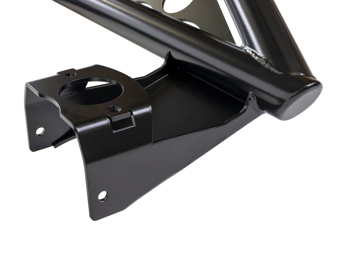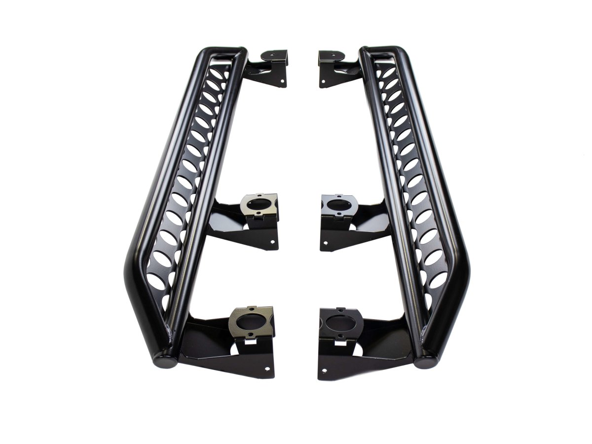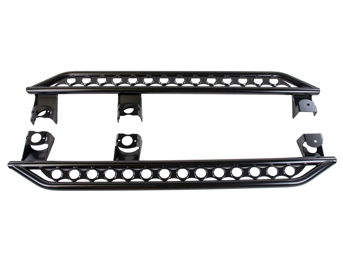 Rusty's Rocker Armor was built with trail abuse in mind. Constructed of 2" x 0.188"-wall DOM tubing, they are strong enough to withstand trail impacts and can even be used as a jack point if needed. The tubing is laser cut and formed in a CNC tubing bender and then placed in a jig and welded by our craftsmen for an exact fit. The rockers feature a second tube, also 2 inch tubing that is bent and welded upward and outward to provide additional door protection, and in between the tubing is sheet of 3/16 P&O steel skid plate with laser cut holes in it for a stylish flare and removing some of the weight from them without loosing any strength. The rockers bolt firmly to the frame using the supplied grade 8 hardware, drilling is required for 6 extra mounting holes on each side. There is no welding required for installation. To top it off, they come with a durable satin black powder coated finish.