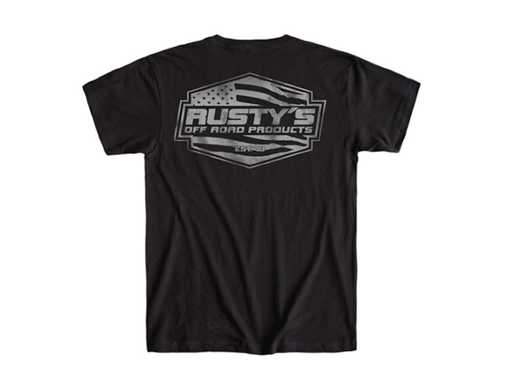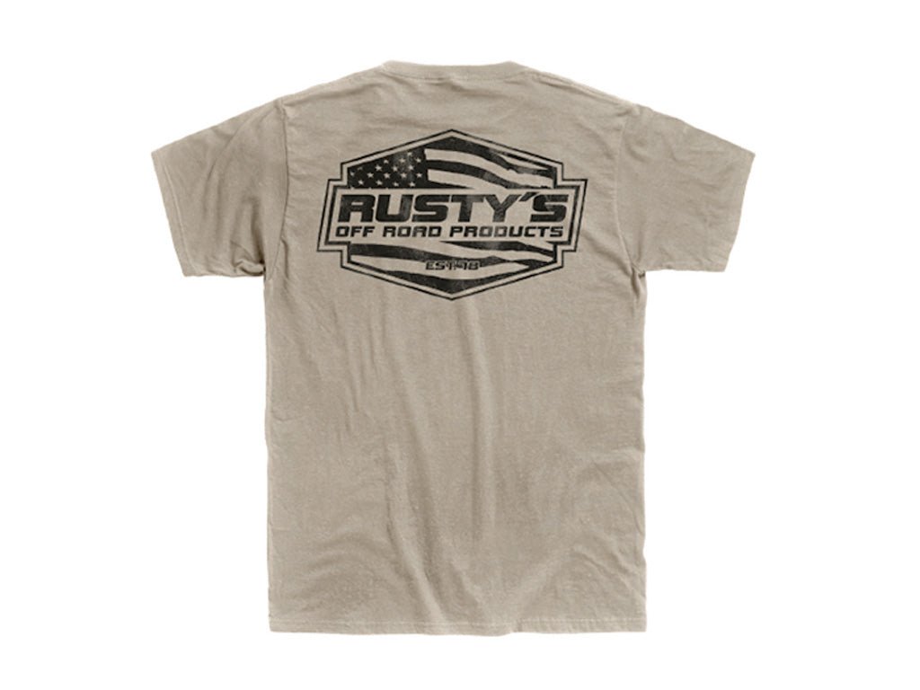 This design has the Rusty's Off-Road logo surrounded by the American Flag on the back of the shirt. The front left chest also has the same logo. Great looking shirt to show your support of Rusty's Off-Road Products and American Made Quality.