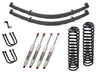 Rusty's kit includes 150 lbs coil springs, our 3.5 full length add a leaf & 1.5 greasable shackles, grade 8 U-bolts, and rear spring degree shims. This kit comes standard with a set of Rusty's beefy lower control arms and a transfer case drop kit to correct driveline angles. A Rusty's adjustable track bar is also included (no wimpy brackets that cause problems here!) along with a pair of sway bar brackets that lower the front sway bar. Rusty's Hydro shocks round out the package.