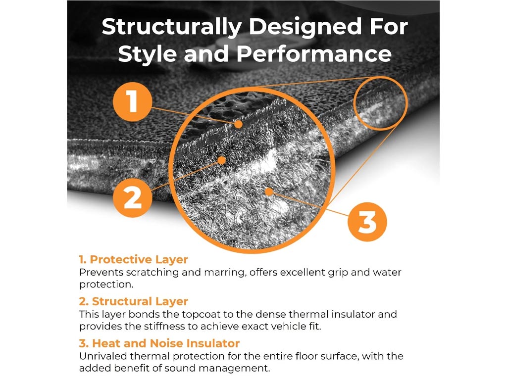 Complete replacement rear flooring system for 2020-current Jeep® Gladiator JT (4Dr) models. Easy to install, easy to clean, reduces cabin heat and noise, and tougher than any floor on the trail for scratch and mar resistance.