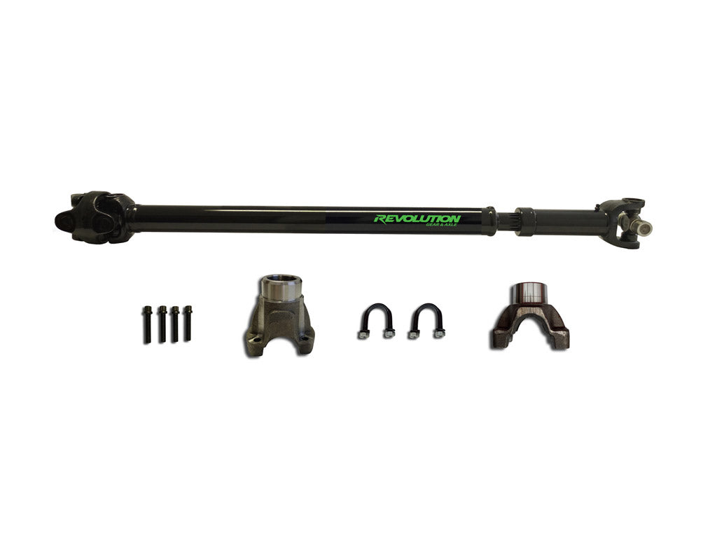 USA Made Premium Rear 1310 CV Driveshaft by Revolution Gear and Axle. Compatible with Jeep Wrangler JL 2 Door Sport and Sahara models. This pinion yoke style driveshaft fits up to 37 Inch tires and a 4.5 Inch Lift. 2 Door models require adjustable rear control arms to set the correct pinion angle to prevent premature wear.