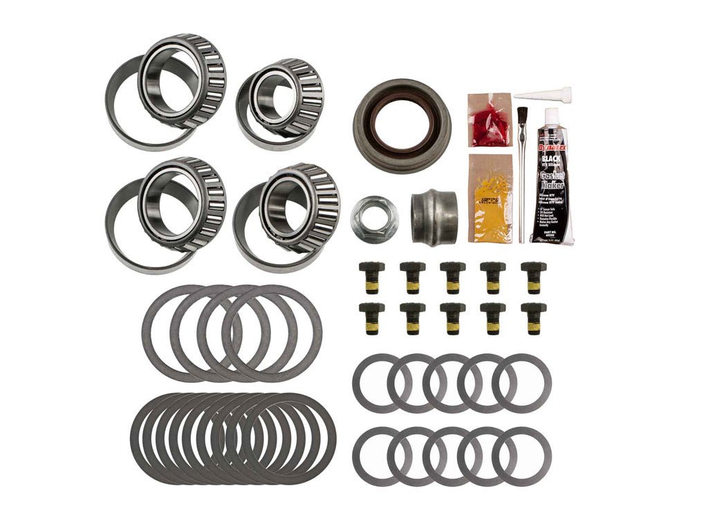• Master Bearing Kit Includes Timken Tapered Bearings (Carrier, Front and Rear Pinion, Pilot where applicable), Brush, Cover Gasket (or RTV), Crush Sleeve (or Preload Shim Pack), Marking Compound, Pinion Nut, Pinion Seal, Ring Gear Bolts, Shims (Pinion, Carrier), and Thread Locking Compound