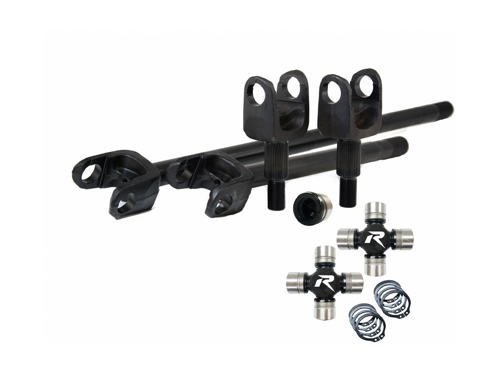 Revolution Gear and Axle Discovery Series 4340 Chromoly Front Axle Kit, fits 2007-18 Wrangler JK Rubicon with Dana 44 Front Axle and 30 Spline axles, only compatible with the factory locker. This Front Axle Kit replaces the Spicer 1350 Style 5-7166X U-Joint with Revolution Gear and Axle's Heavy Duty Chromoly 1350 Style Needle Bearing U-Joints creating the strongest axle setup and allows extra clearance for tighter turning versus the smaller 5-760X U-Joint.