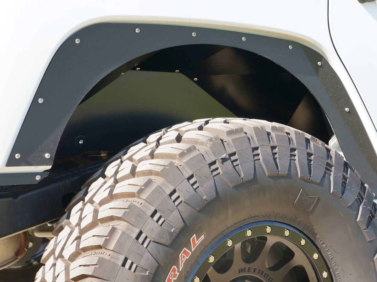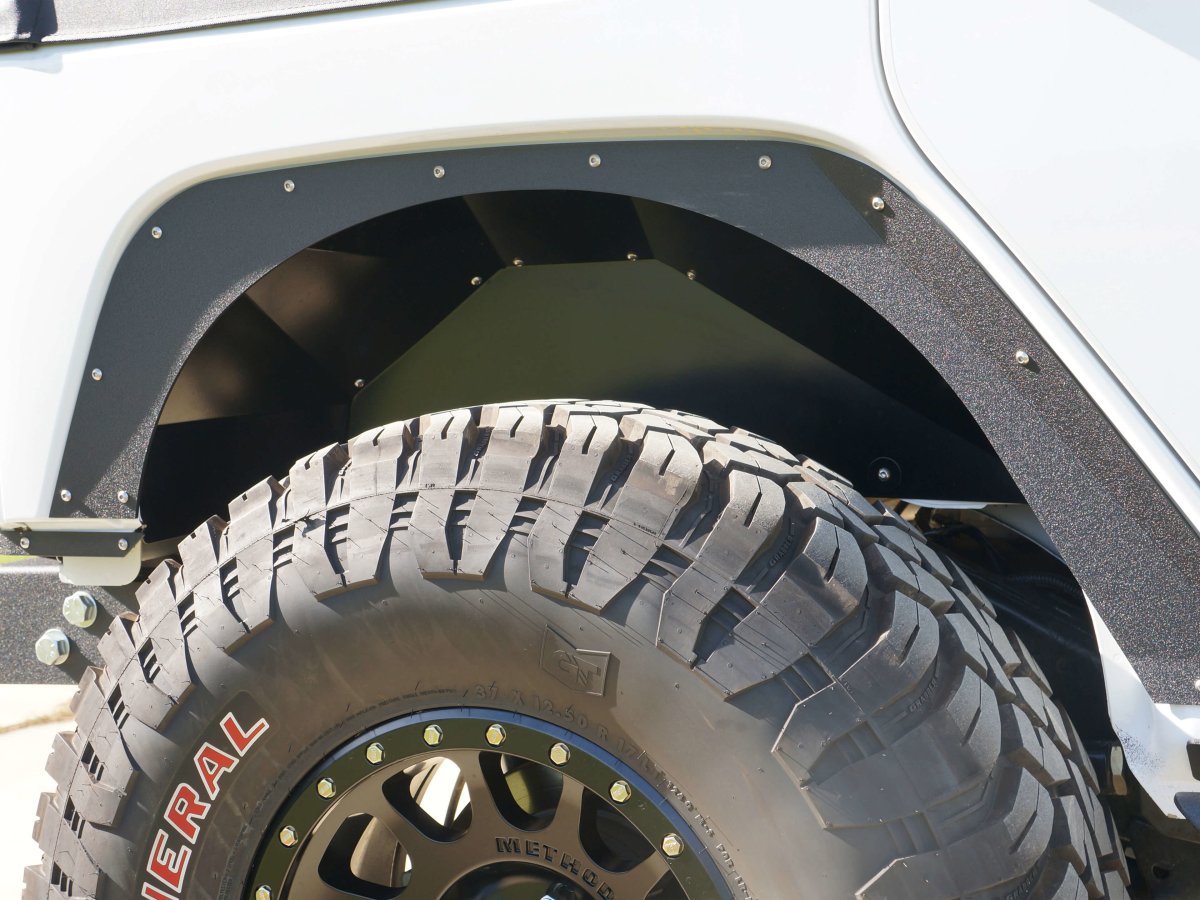 Constructed of 0.065-inch laser-cut steel, the inner fenderwells are CNC formed for an exact fit and are then treated with a durable black satin powder coated finish. Rusty's Rear Inner Fenderwells are a perfect combination with our Skinny Fenders, our Fender Fare Delete Kit, our front Inner Fenderwells, or just about any aftermarket fender flare.