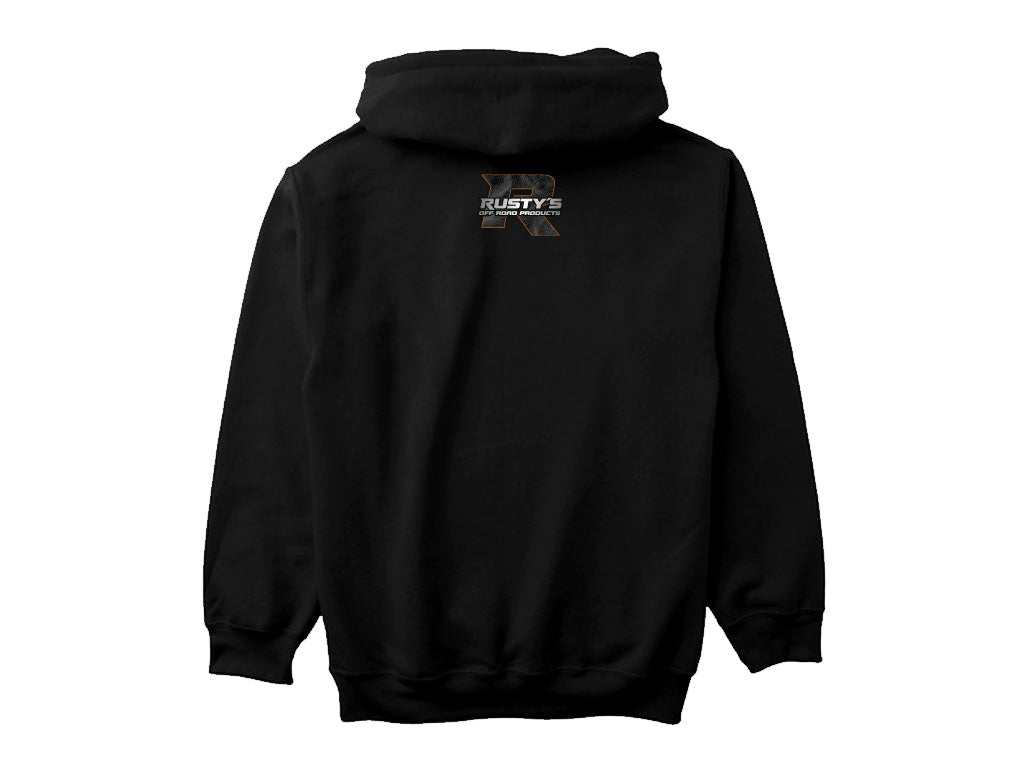 Introducing our stylish and comfortable black pullover hoodie featuring the iconic Rusty's Offroad Products logo with a topographic map infilled R. Crafted from high-quality materials, this hoodie is perfect for any casual occasion, whether you're hitting the trails or simply running errands around town. The sleek black color complements any outfit, while the topographic map-infused R adds a unique and eye-catching touch.