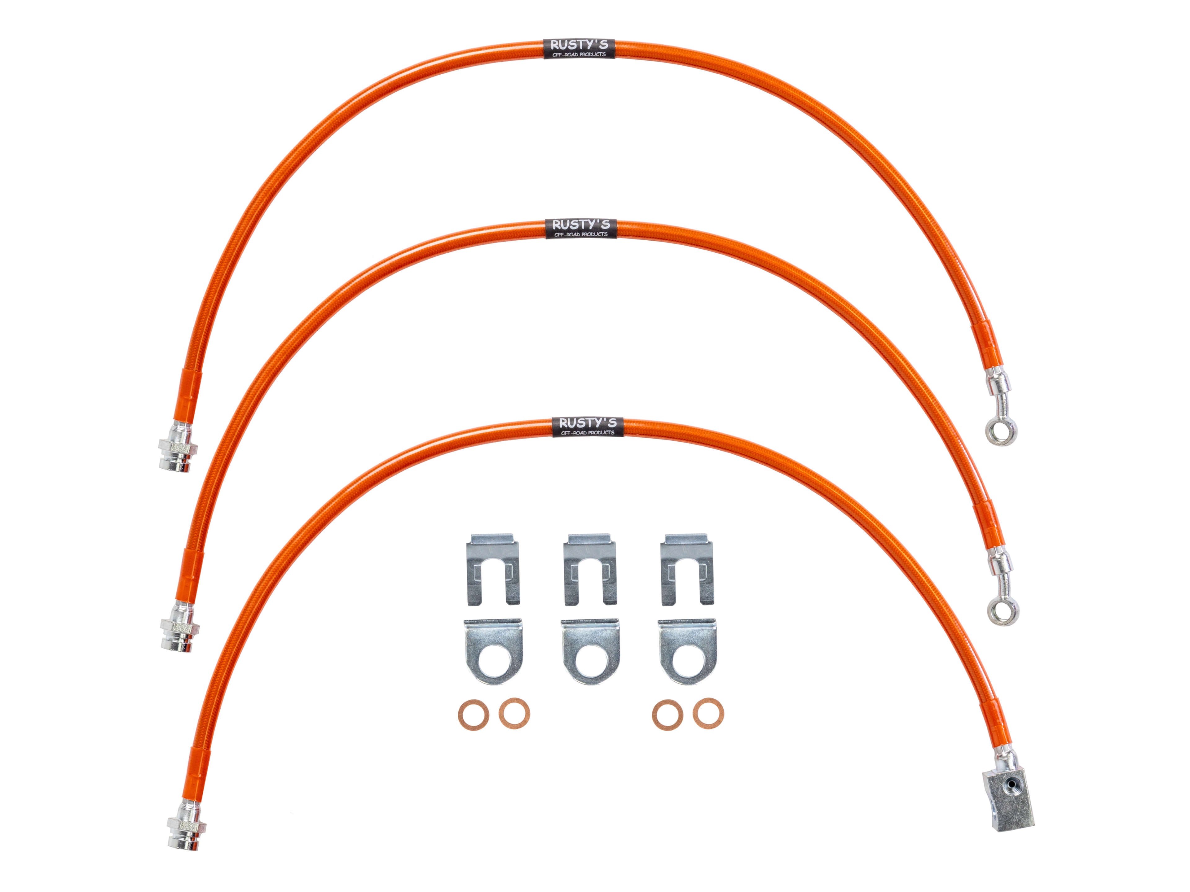 Rusty's uses Crown Performance Braided Stainless Steel Brake Hoses because of their superior quality and precise fit. Rusty's brake hoses provide the added length needed to work with our lift systems while also improving braking response. With Rusty's hoses there is no appreciable volumetric expansion, which means the brake hoses don't expand when under pressure like factory rubber hoses. They are 100% DOT-approved and include a multi-layer protection system that adds strength as well as resistance to chaffing and abrasion. We offer several extended lengths that match the lift height on your Jeep.