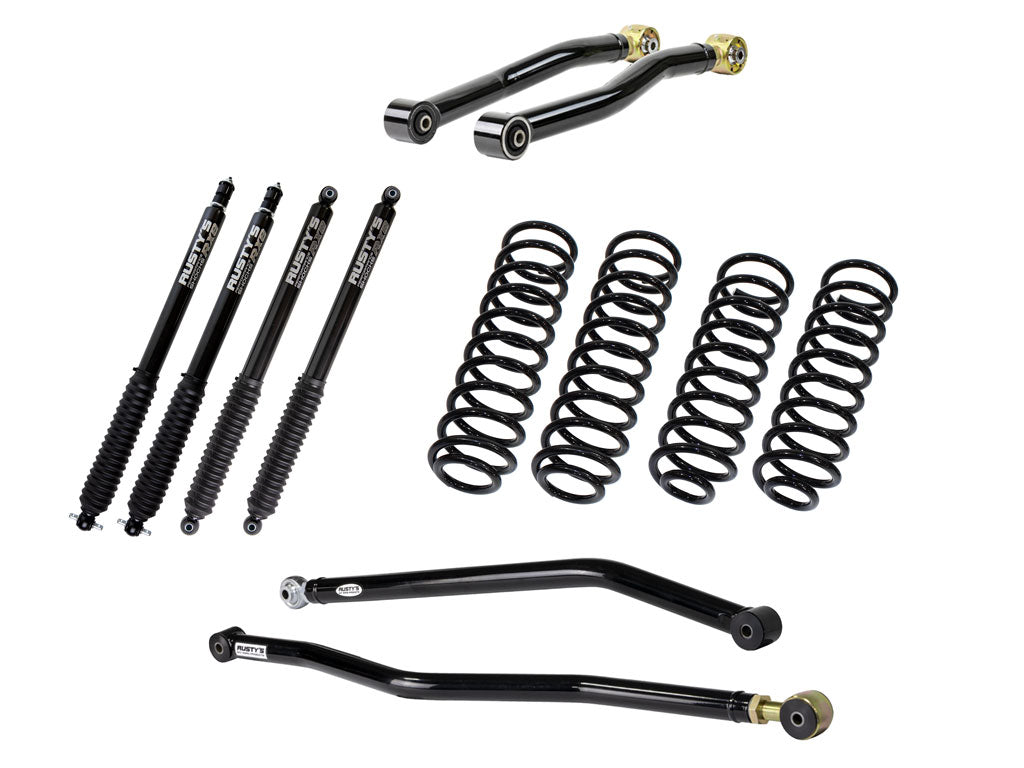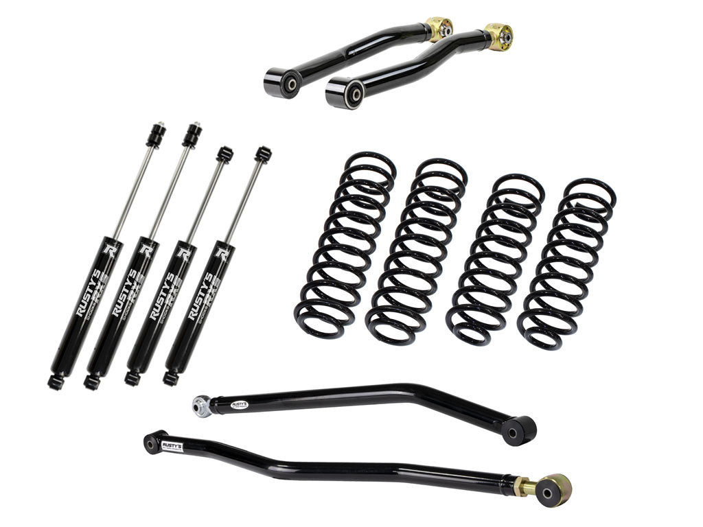 The Rusty's Plus kit starts with everything that is included in our Basic kit. This includes our replacement front and rear coil springs that are designed to deliver the same ride as the factory but with an emphasis on better off-road capability. The axles are properly centered under the frame with our front and rear adjustable track bars, and a complete set of Rusty's Performance Shocks provide the on-road ride quality you've come to expect with the off-road performance you desire. Then the "Starter" kicks in with a set of our adjustable front lower control arms. These arms are heavy-duty, constructed with heavy-wall 2-inch DOM tubing that is mandrel bent to provide necessary tire clearance. The forged adjustable ends use massive 1.25-inch threads for even more strength. The fixed ends of the arms feature OEM Clevite rubber bushings for superior longevity and quiet operation, while the adjustable forged ends are available with either OEM rubber or our Forged Flex Joints for additional bind-free suspension flex. Both the front and rear lower control arms are adjustable, allowing the user to fine-tune driveline angles, wheelbase, and caster.