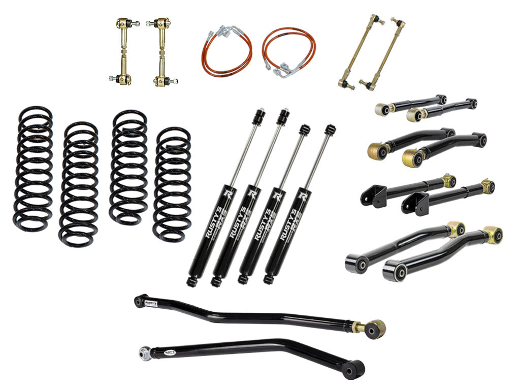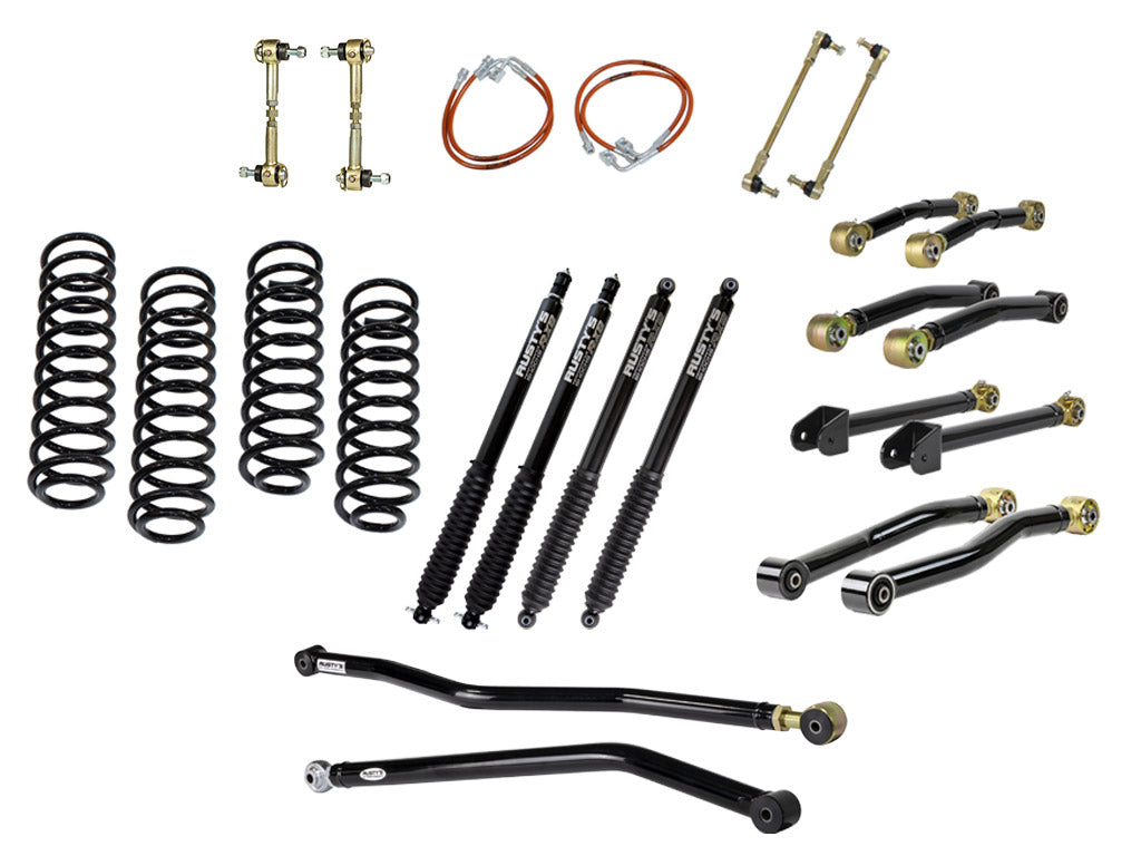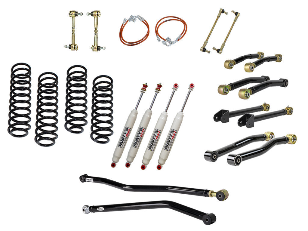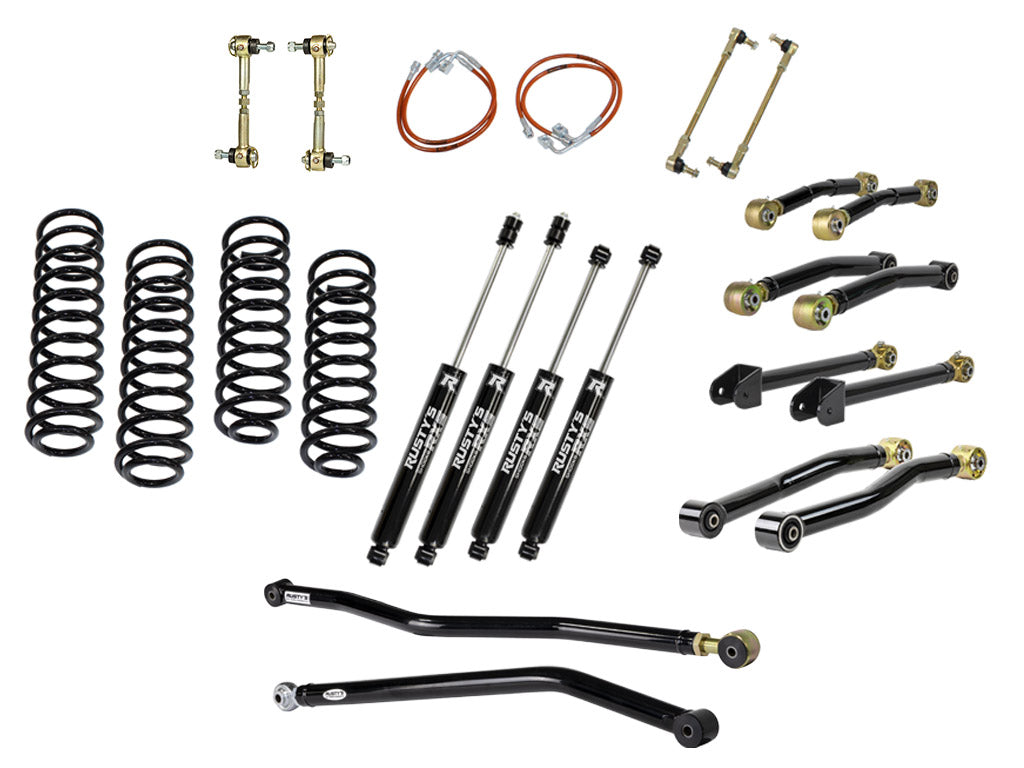 The Rusty's Performance kit starts with everything needed in one kit to build your JK Wrangler to crawl the rocks, run the high mountain roads or take the boat to the lake. This suspension kit includes our replacement front and rear coil springs, proudly made in the USA, that are designed to deliver the same ride as the factory but with an emphasis on better off-road capability. The axles are properly centered under the frame with Rusty's front and rear adjustable track bars. Then the "Performance" kicks in with a complete set of Rusty's Adjustable Control Arms. These arms are heavy-duty constructed with beefy 2-inch DOM tubing that is mandrel-bent to provide necessary tire clearance. The adjustable forged flex ends use massive 1.25-inch threads for even more strength. They are also re-buildable, the massive front and rear lower arms are also a High Clearance design, The fixed ends of the arms feature Rusty's OEM style rubber bushings for superior longevity and quiet operation, while the Rusty's Re-buildable Adjustable Forged Flex Joints offer's maximum articulation and additional bind-free suspension flex. The front and rear lower control arms being adjustable allow the user to fine-tune driveline angles, wheelbase, and caster. This is huge when setting up the suspension for proper handling and driving.