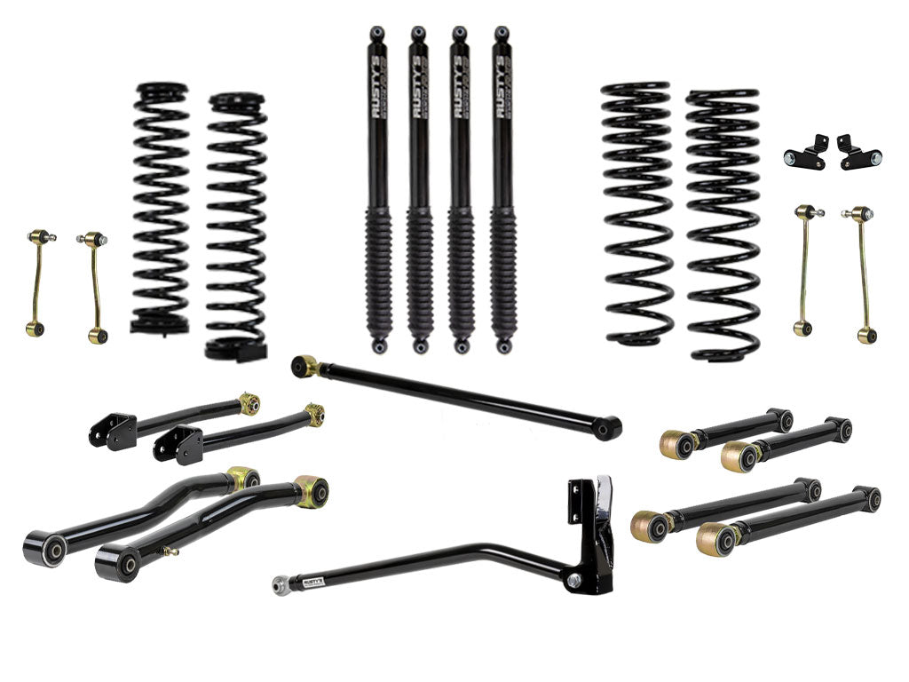 This extensive development takes time and is costly to design and build. Beware of many manufacturers and their one-size-fits-all mentality by using springs that are designed for other applications. It's certainly cheaper to borrow designs from previous platforms, and it gets you to market more quickly, but that doesn't make it right. Rusty’s JT coils springs were developed specifically for the JT Gladiator so that you can be assured the ride height of the vehicle will be correct, with no cheesy offset spacers needed to keep the vehicle level or reduce spring bowing or one fit all coils with isolators to convert he mounting.