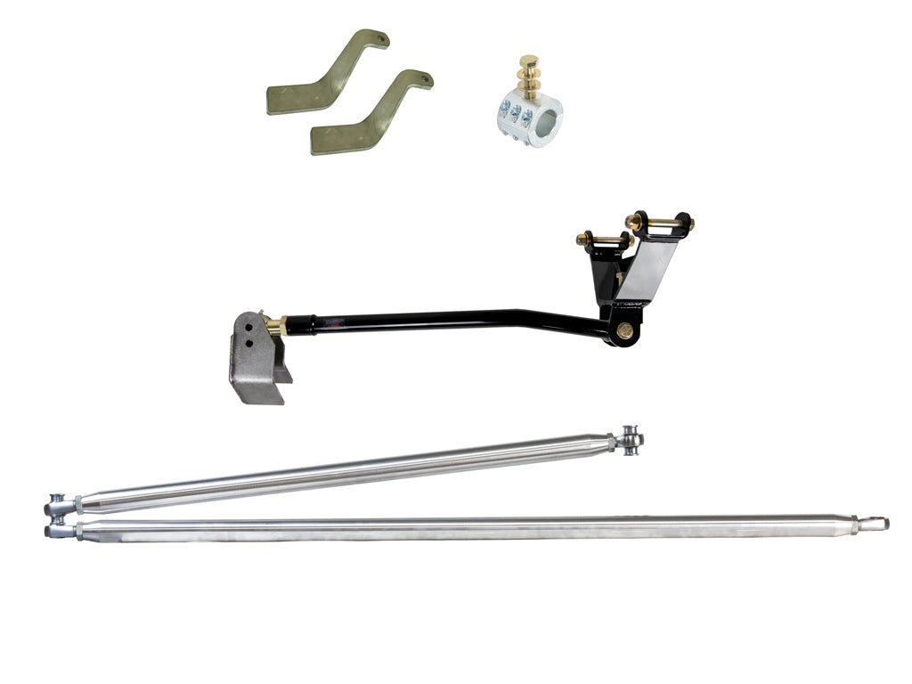 The Rusty's OTK Steering System consists of a tie rod with off-set rod ends, drag link, adjustable track bar, track bar frame mount, a weld-on track bar axle mount, sway bar mounts, stabilizer mount, and all the hardware. That's right, all of these components are required in order to get the job done safely and properly! Keeping the track bar and the drag link parallel is a must or you could have something that drives worse.