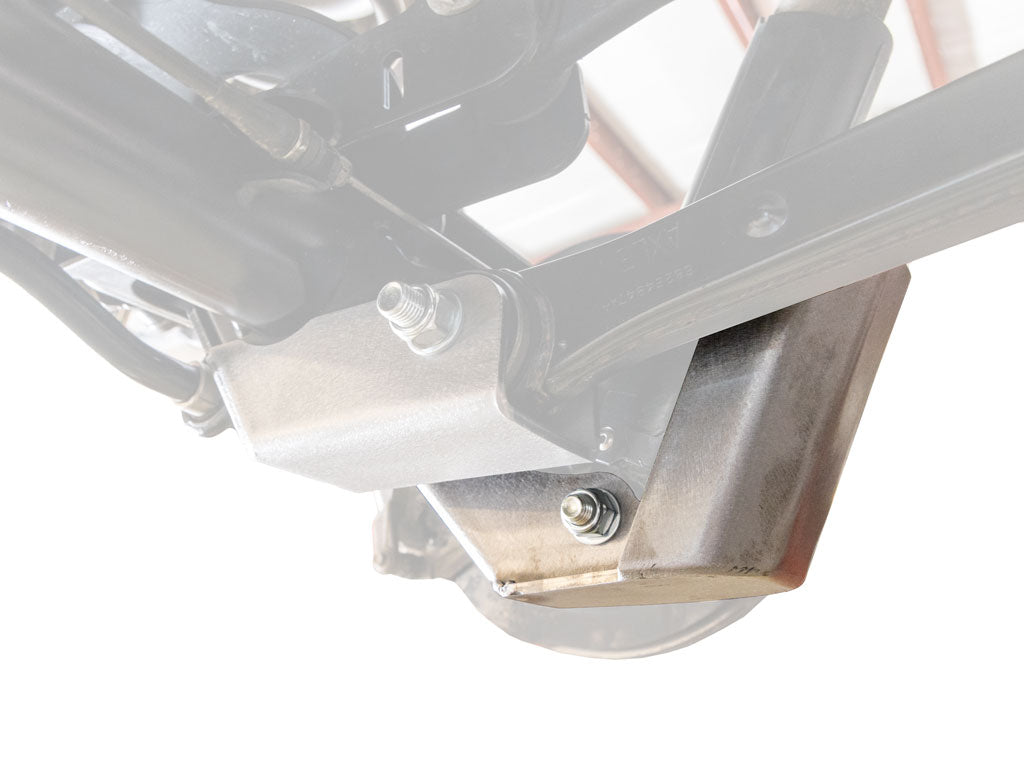 The rear shock & shock mounts on the JT hang low on the axle and the front of the shocks and mounts are vulnerable to trail damage. Rusty's Rear Axle Lower Shock Skid Plates reinforce these easily damaged shock mounts, protect your shocks, and bolt into place! That's right, no welding required. Constructed of 1/4" laser-cut steel that is then CNC formed for a precision fit, and provides a beefy skid plate as well as a ramp that can help push the mount up and over obstacles rather than getting hung up and stopping you cold. These skid plates reinforce the lower shock mount without interfering with the shocks ability to move within the mount.