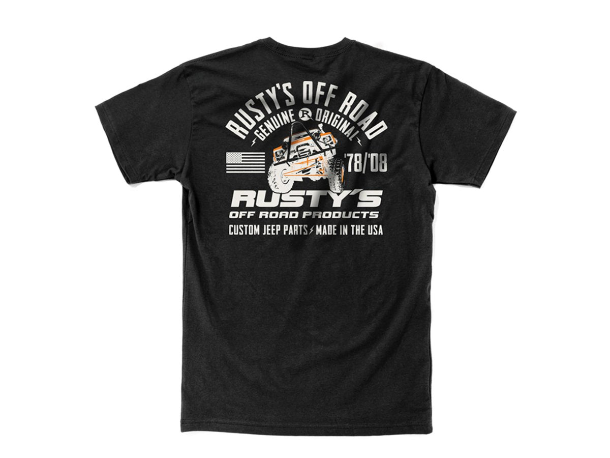 We would like to introduce you to our new Anniversary t-shirt designs that highlight a few of our passions that have made Rusty's Off-Road endure the test of time! Show your support for made in the USA products! Our newest t-shirt design features our iconic Orange XJ, the American Flag and Years in business on the back, and our logo on the front left chest. Sizes S-2XL.