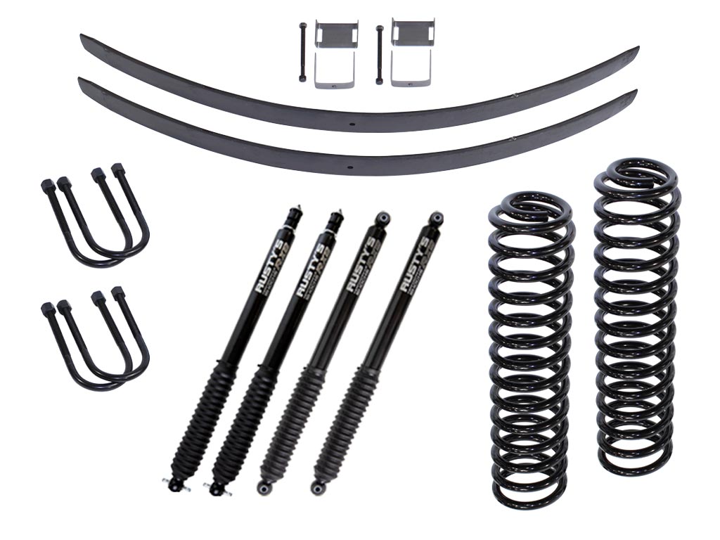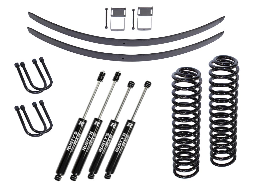 Rusty’s 2" suspension lift will result in increased off-road performance, better hauling and towing capability, and an excellent ride. The kit consists of Rusty’s 2" front coils, 2 full-length add-a-leafs, U-bolts, and your choice of Rusty's Performance Shocks.