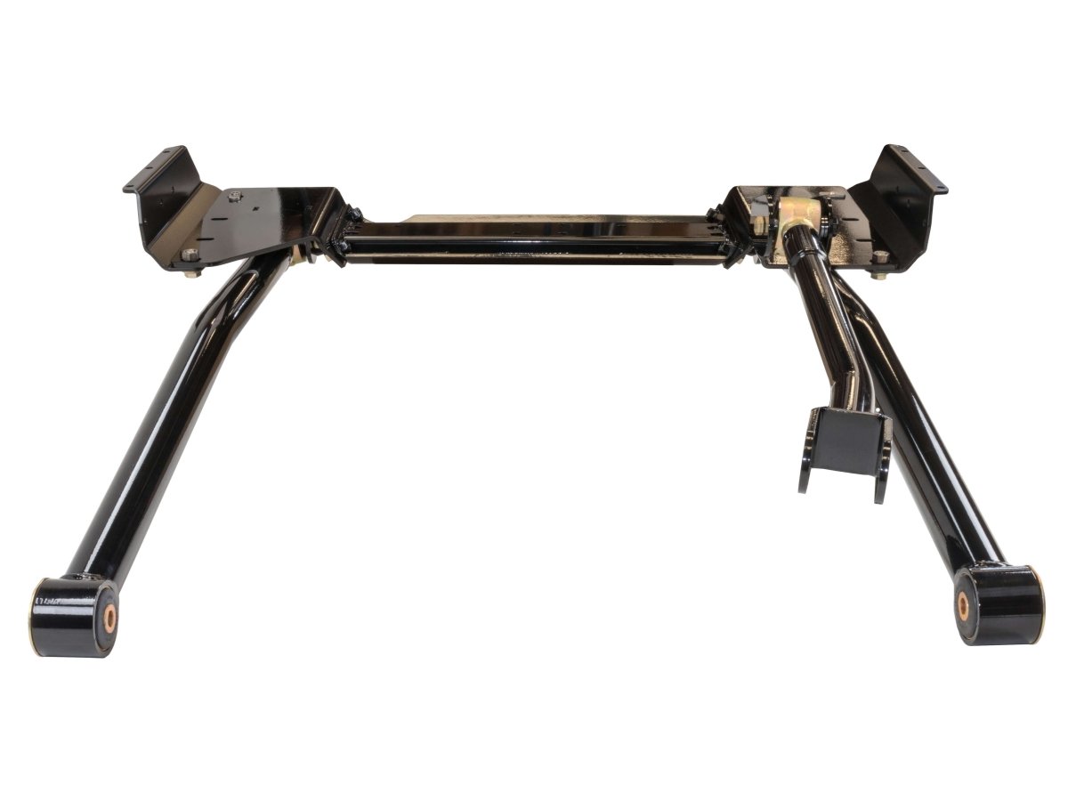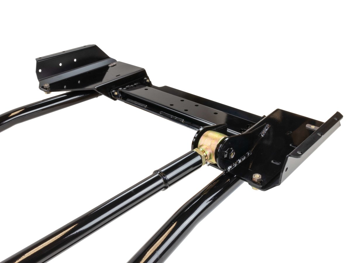 The new control arms bolt to a new 1/4-inch thick laser-cut steel 3-piece crossmember with a removable center section. This new design offers easier service and maintenance and is also surrounded by Rusty's frame reinforcement brackets. The 3/16" laser cut CNC formed reinforcement brackets are located on both the outside and the inside of the unibody and basically sandwich it, tying the unibody and the new crossmember together as one solid unit. This design distributes the extreme loads from the suspension over a much larger area of the unibody and assures many years of extreme four-wheeling without any structural damage to the unibody. The crossmember's design does not reduce ground clearance and also drops the transfer case to relieve driveline angles. Our optional Transfer Case Skid Plate can be easily added for further protection and support.