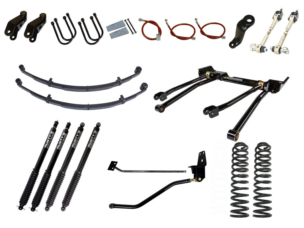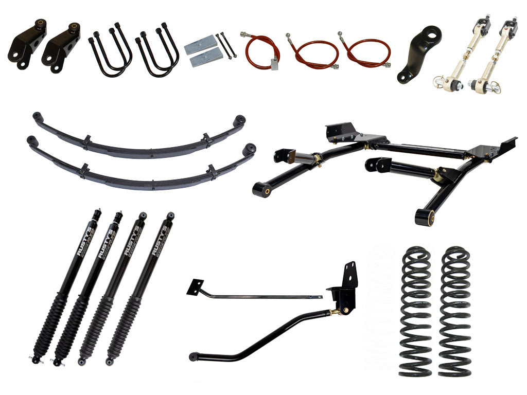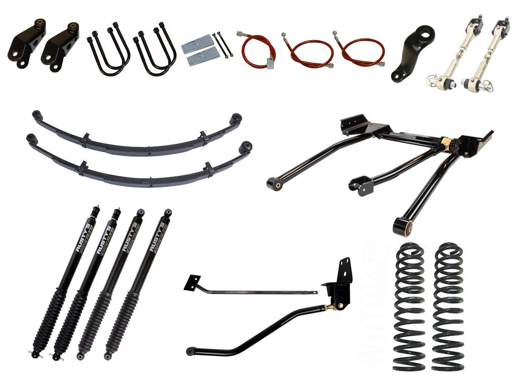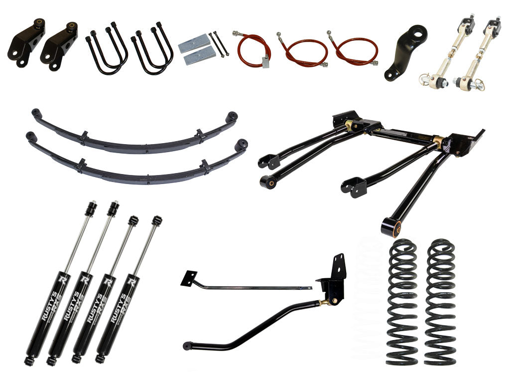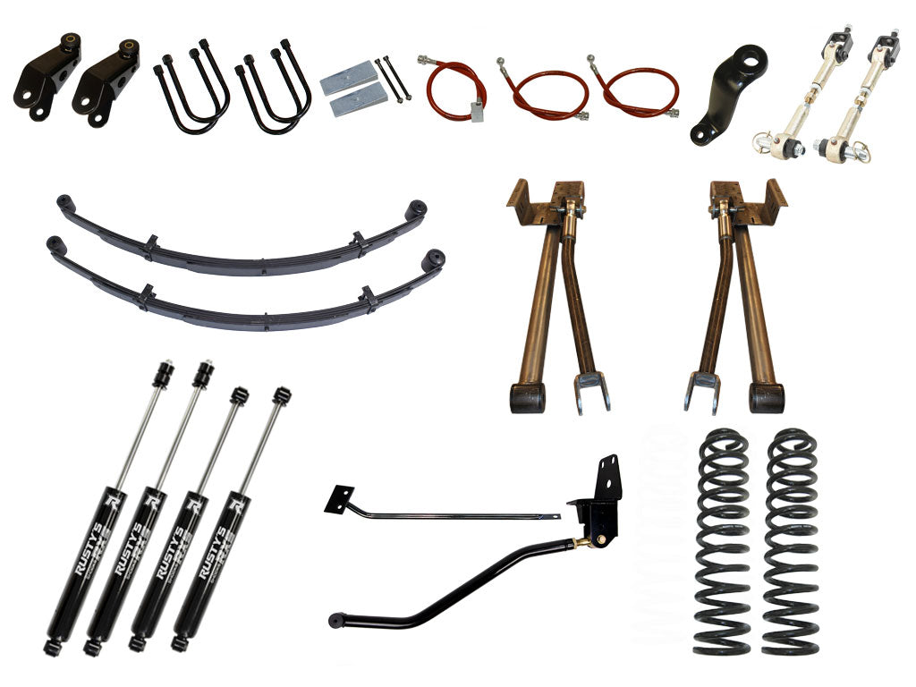 The Rusty's 8" long-travel suspension is a complete package; we didn't cut any corners. Rusty's high quality 8.5 coils springs are used in the front, while complete 6.5 leaf spring packs, grade 8 U-bolts, and heavy duty boomerang extended shackles are used in the rear. NO LIFT BLOCKS! Rusty's heavy-duty track bar, frame mount, and frame brace keeps the body centered and adds significant strength to the unibody. Rusty's 3 inch drop pitman arm is included to keep the steering straight and to keep the tie rod ends from binding during extreme flex. The Rusty's Kevlar stainless steel brake lines offer better brake performance and give the extra length needed for long-travel suspension systems. Rusty's own sway bar disconnects are used for maximum flex off road and can be re-attached in just seconds for great on-road handling. Rusty's Hydro shocks offer great handling on the street and an emphasis on off-road performance. Rusty's mono tube shocks are available.