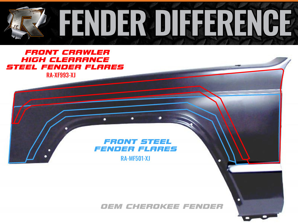 Rusty's crawler high clearance fender flares are the direct result of customer requests for better, more unique body armor for the XJ Cherokee, and we delivered! Rusty's new XJ Extreme-Clearance Fender Flares are built for hardcore trail use and combine aggressive styling with excellent functionality. The body panels are constructed of 1/8" steel, while the flare portion is 3/16". All of the fender components are laser-cut, CNC formed, and then robotically welded for an exact fit. In fact, the flares are constructed in such a way that there are no welds visible on the exterior, so they have strength and good looks to match! Whether you're trying to protect your XJ from damage on the trail or need to cover up some existing trail boo-boos, these are a great solution!